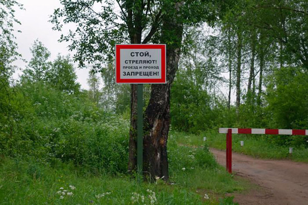 Границы запретной зоны полигона в полевых дорогах, обочинах, полосах отчуждения ж/д обозначены знаками предупреждения белого цвета с красной каймой с надписями: «СТОЙ, СТРЕЛЯЮТ! ПРОЕЗД И ПРОХОД ЗАПРЕЩЕН!».