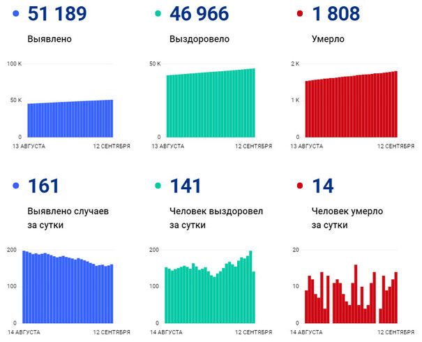 Под данным Роспотребнадзора на 12 сентября, за последние сутки в регионе зафиксировано еще 14 смертей от COVID-19. Всего же за пандемию погибло 1808 жителей Владимирской области. Смертность на 100000 жителей составляет 130,8 человека.