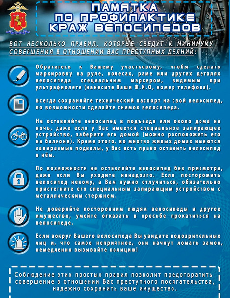 Будьте внимательны и не оставляйте своего двухколесного коня без присмотра, пристегивайте его замком, не оставляйте велосипед на улице и в подъезде на ночь.