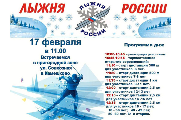 17 февраля камешковцев, а также гостей города и района приглашают принять участие в соревнованиях «Лыжня России 2024». Они состоятся в субботу, 17 февраля в 11.00 в пригородной зоне улицы Совхозной города Камешково.