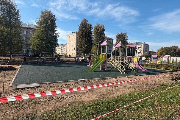 Устанавливается резиновое покрытие на детской площадке, новое оборудование, производится обустройство площадок под скамейки и урны, их монтаж, прокладка дополнительных тротуаров.