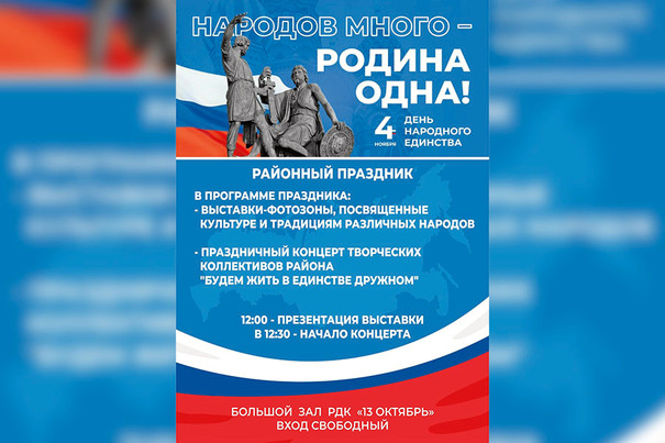 Камешковцев приглашают на районный праздник, посвящённый Дню народного единства, «Народов много — Родина одна!». Он состоится 4 ноября в РДК «13 Октябрь».