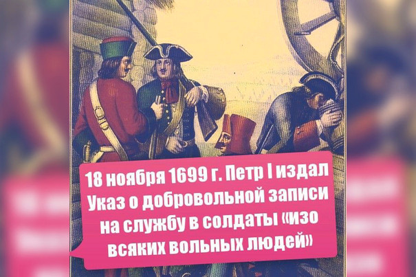 В 1699 году в этот день был издан указ царя Петра I «О наборе вольных людей и кто похочет в службу идти в солдаты», что стало началом формирования регулярной армии России и первым опытом армейской службы на контрактной основе.