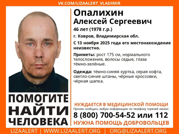 Поисковый отряд «Лиза Алерт» просит помощи в поиске 46-летнего Алексея Сергеевича Опалихина из города Коврова.