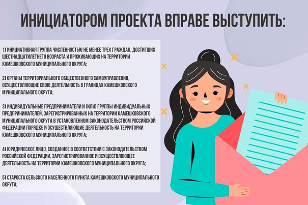 Прием инициативных проектов осуществляется администрацией Камешковского округа в рабочие дни с 8:00 до 12:00 и с 13:00 до 17:00 по адресу: г. Камешково, ул.Свердлова д.10, каб. 58.