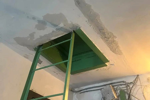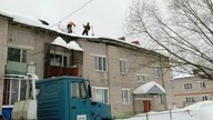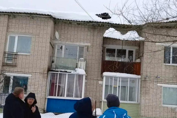 Жильцам дома в настоящее время ничего не угрожает. Проводится очистка снега, разбор досок и укрытие повреждения.