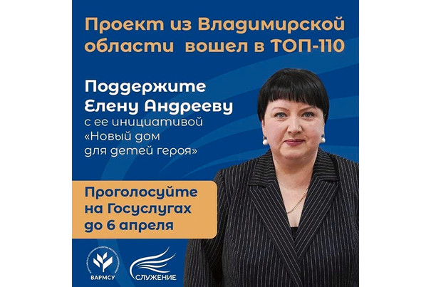 В этом году на соискание поступило более 63 тысяч заявок. Среди 110 финалистов — проект Елены Андреевой, первого замглавы администрации Собинского муниципального округа, в номинации «Мужество и героизм на благо служения Родине».