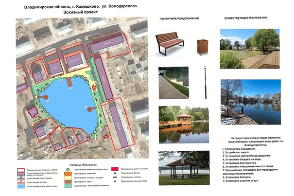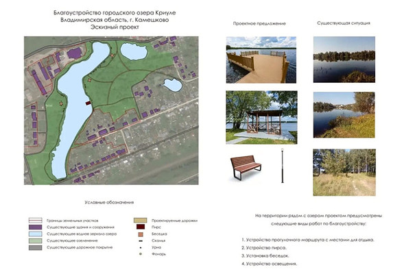 Камешковцам предложено выбрать для благоустройства одну из территорий: берег озера Криуля или общественную территорию, прилегающую к пруду по ул. Володарского, в городе Камешково.
